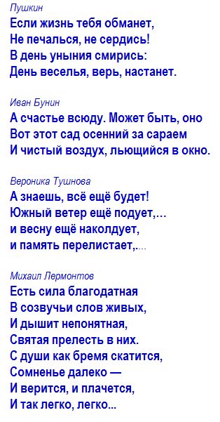 Поэзия обладает удивительной способностью проникать в подсознание, оставлять глубокий след в эмоциональной памяти. Это происходит, благодаря особой ритмичности и рифме стихов. А если стихи написаны гением, то в них особая сила и энергия. Это может нам помочь достичь результата, которого мы ждем от аутотренинга. Такие подборки для «поэтического аутотренинга» могут служить любым нашим житейским целям и задачам.