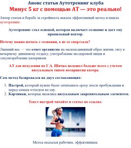 АТ для похудения по Г.А. Шичко подошел больше всего с учетом визуальным типом восприятия автора.