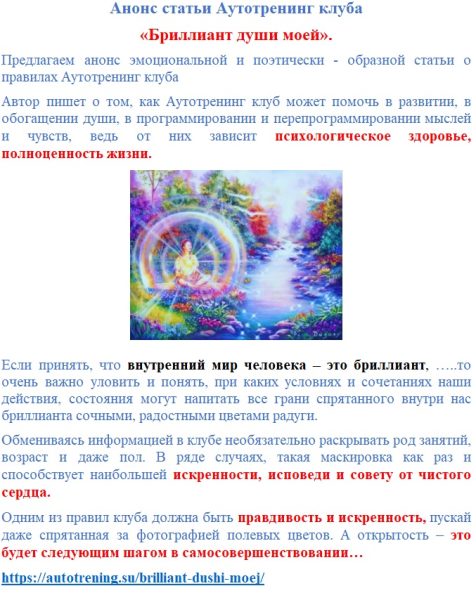 Предлагаем анонс эмоциональной и поэтически — образной статьи о правилах Аутотренинг клуба