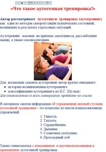 Автор рассматривает Аутогенную тренировку (аутотренинг) как один из методов саморегуляции психических состояний, возникших в результате стрессовых ситуаций.