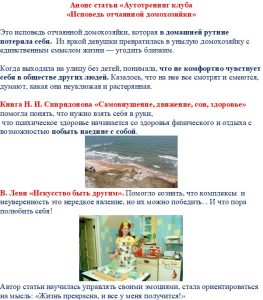 Книга Н. И. Спиридонова «Самовнушение, движение, сон, здоровье» помогла понять, что нужно взять себя в руки, что психическое здоровье начинается со здоровья физического и отдыха с возможностью побыть наедине с собой.