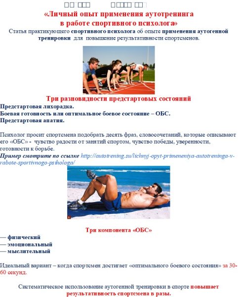 Систематическое использование аутогенной тренировки в спорте повышает результативность спортсмена в разы.