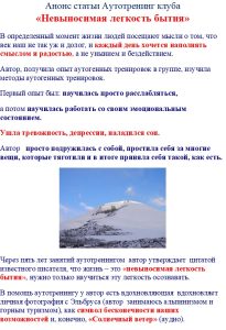 Через пять лет занятий аутотренингом автор утверждает цитатой известного писателя, что жизнь – это «невыносимая легкость бытия», нужно только научиться эту легкость осознавать.