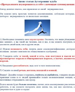 1 Комментарий на "Анонс статьи Аутотренинг клуба «Преодолеваем неуверенность в себе с помощью самовнушения»"