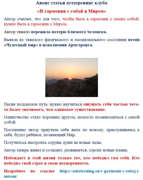 Автор считает, что для того, чтобы быть в гармонии с самим собой, нужно быть в гармонии с Миром.