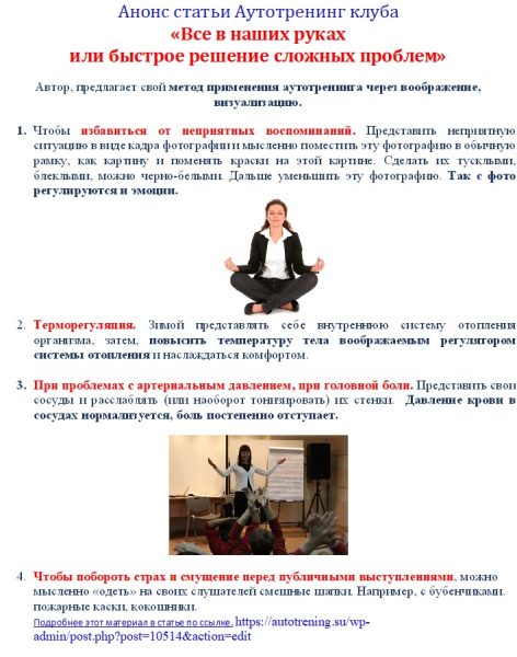 Автор, предлагает свой метод применения аутотренинга через воображение, визуализацию.