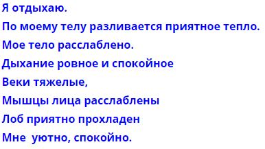 Если настигла бессонница, важно не зацикливаться на ней, не заставлять себя спать, а спокойно и даже приятно провести время. Помечтать о чем-то или использовать это время для различных видов аутотренинга, особенно тех, что применяются как раз пред сном. Именно перед сном, когда организм расслаблен, формулы аутотренинга работают максимально эффективно.