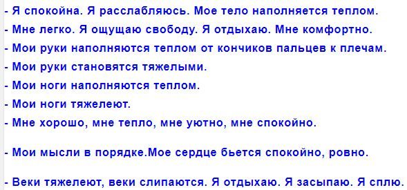 Пропив назначенные препараты, я обнаружила ,что все симптомы ушли, но бессонница осталась. Тогда я обратилась за помощью к аутотренингу (АТ). Занятиям я уделяла всего 10-15 минут в день — при моем напряженном графике это было оптимально. Я поняла, что моей проблемой было то, что я не могла расслабиться, чтобы заснуть. Комнату перед сном я проветривала, затем укладывалась поудобнее на спину, руки вытягивала вдоль тела. Фразы, которые я проговаривала для засыпания: