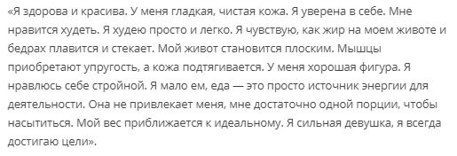 Это — утренний и вечерний вариант. После еды текст был несколько иной. Я убеждала себя, что мне нравится есть то, что у меня в тарелке, что это вкусное и полезное и дает мне быть сильной, красивой и стройной. Главное, что эти слова нужно проговаривать в настоящем времени, воспринимая, как уже сбывшийся факт. Это, честно говоря, было очень сложно.