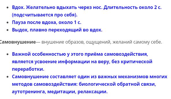 Для меня стало совершенно ясно, что только я сам могу помочь решить мои возникшие вопросы. И самовнушение играет здесь немаловажную роль. При различных стрессовых ситуация, будь то сдача экзамена или защита диплома, я старался применять одно хорошее упражнения «дыхание» — по вырабатыванию равномерного дыхания. Это одно из самых простых и эффективных методов релаксации — диафрагмальное дыхание (при дыхании в основном поднимается и опускается живот, грудь двигается меньше). Существует множество вариантов, примером может служить разновидность упражнения «подсчёт дыхания».