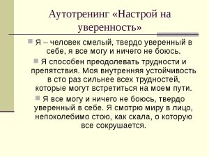 Я вышла из этого состояния, я сама себя спасла и поняла, что нет ничего невозможного и нужно надеяться только на себя. Благодаря АТ на уверенность, я смогла поверить в себя и поднять свою самооценку.